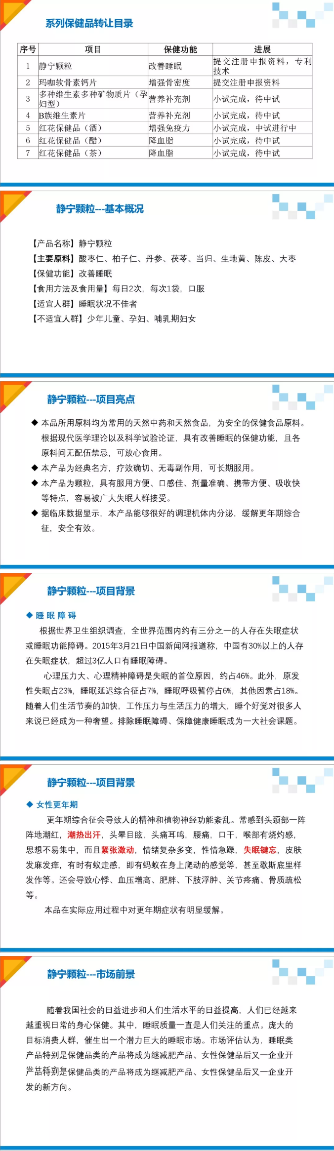 摘要 改善睡眠、增強骨密度、營養(yǎng)補充劑、降血脂、提高免疫力等系列保健品項目包括:1個顆粒劑、3個片劑、3個紅花系列。